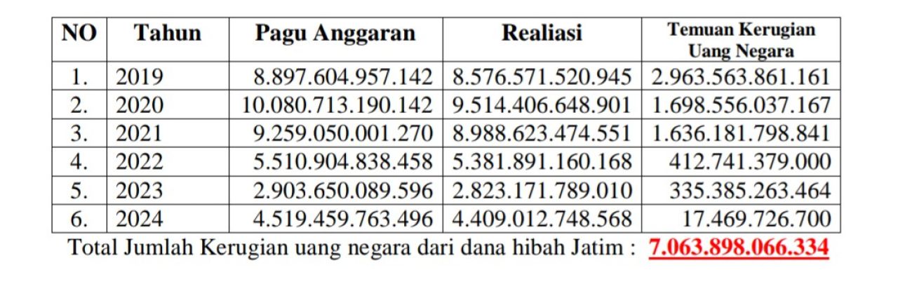 Ketua Jaka Jatim, Musfiq, menegaskan sejak anggaran 2019 hingga 2024, alokasi anggaran dana hibah Pemprov Jatim tidaklah sedikit.