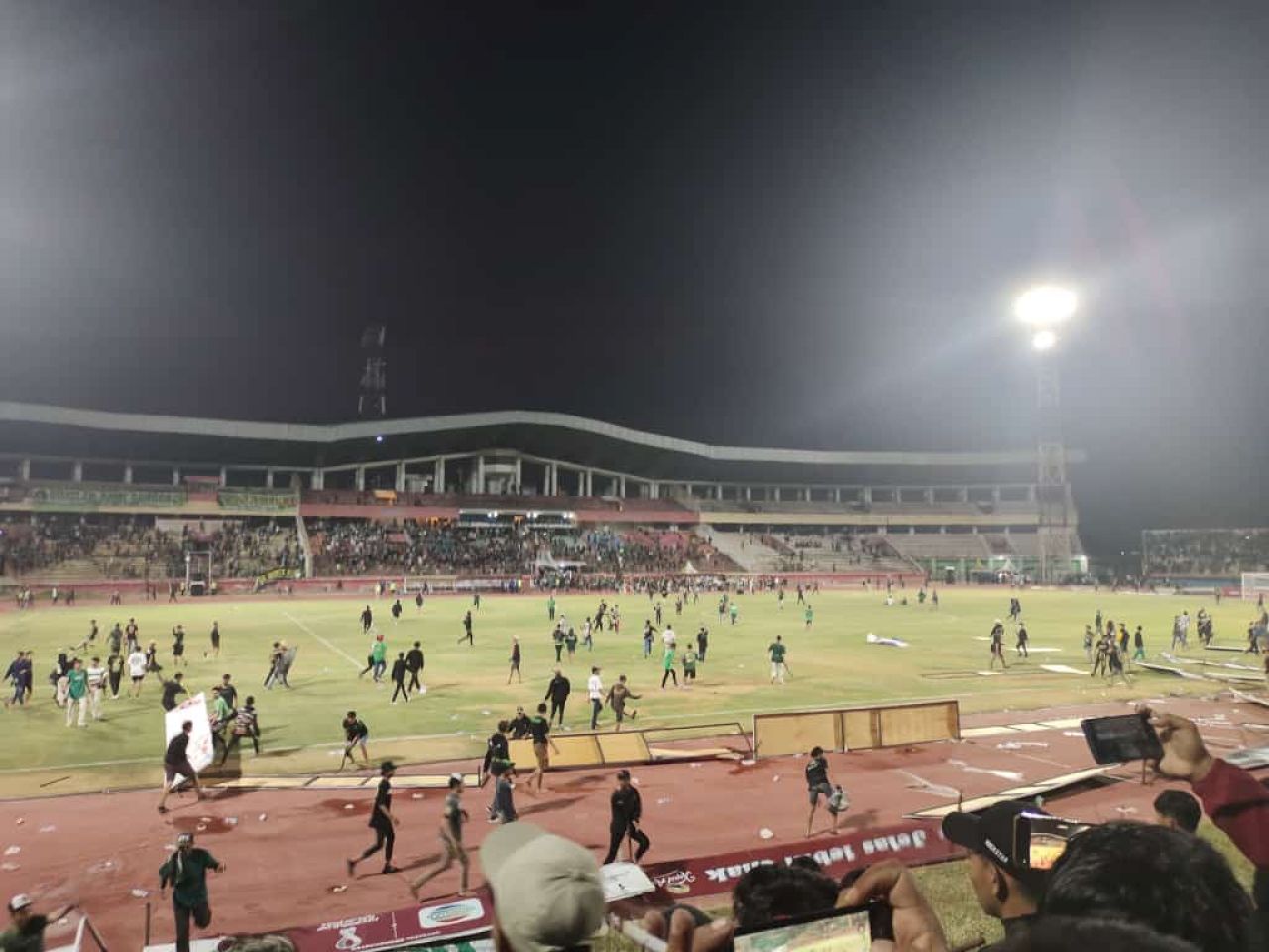 Selain itu mereka juga merusak papan reklame dan tempat duduk pemain dan pelatih di pinggir lapangan.