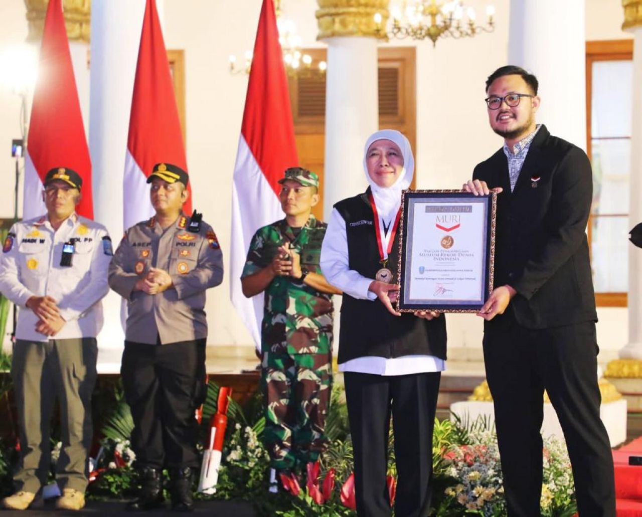 Penghargaan Rekor Dunia MURI dan Rekor Indonesia MURI tersebut diserahkan oleh Customer Relation Manager Museum Rekor Dunia Indonesia, Lutfi Syah Pradana kepada Gubernur Khofifah dalam rangkaian Upacara Apel Patroli Sigap Jaga Lindungi Masyarakat Jawa Timur di malam tahun baru 2023 (SIJALINMAJATARU) di Halaman Gedung Negara Grahadi Surabaya, Sabtu (31/12) malam jelang pergantian tahun 2023.