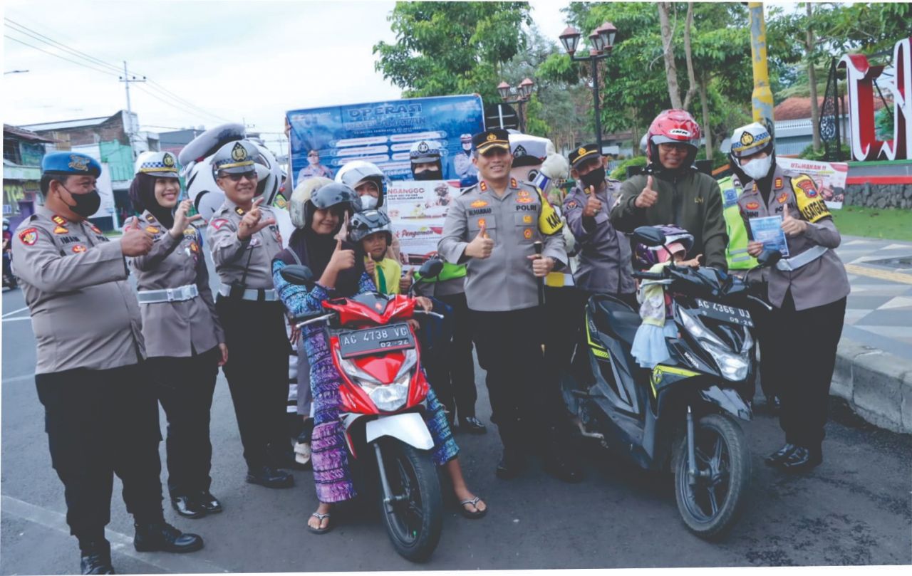Kampanye Keselamatan Berkendara, Kapolres Nganjuk Bagikan Helm Gratis