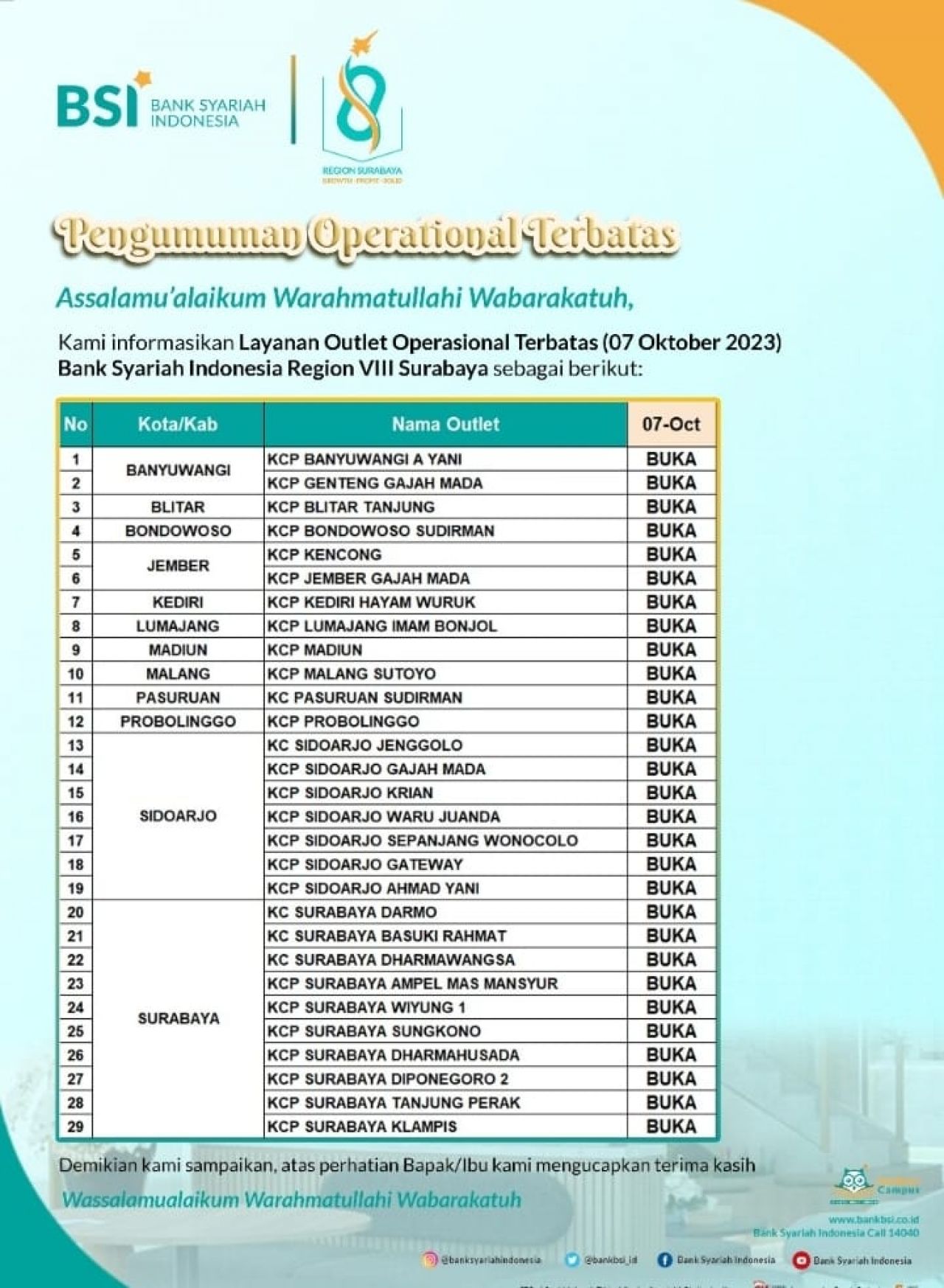 Sebagai informasi, terkait Kantor Cabang yang melaksanakan operasional terbatas, dapat menghubungi BSI Call 14040. (dji)