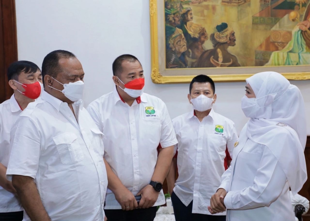 Ketua Umum Komite Olahraga Nasional Indonesia (KONI) Jawa Timur Muhammad Nabil , Ketua Umum Pengprov PBSI Jawa Timur Tony Wahyudi dan Gubernur Khofifah. di Gedung Negara Grahadi, Surabaya, Jumat (27/5) malam.