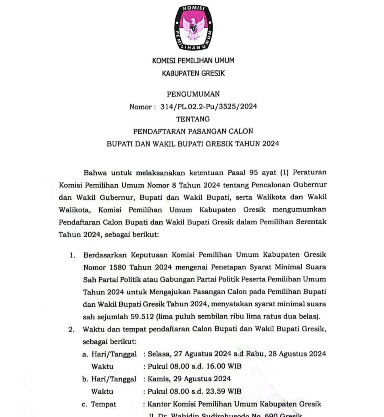 Pengumuman ini berdasarkan Pengumuman Pendaftaran Calon Bupati dan Wakil Bupati Gresik yang dikeluarkan oleh KPU Gresik, pada tanggal 24 Agustus 2024, dan ditanda tangani oleh Ketua Komisi Pemilihan Umum Kabupaten, Gresik Akhmad Taufik. (*)