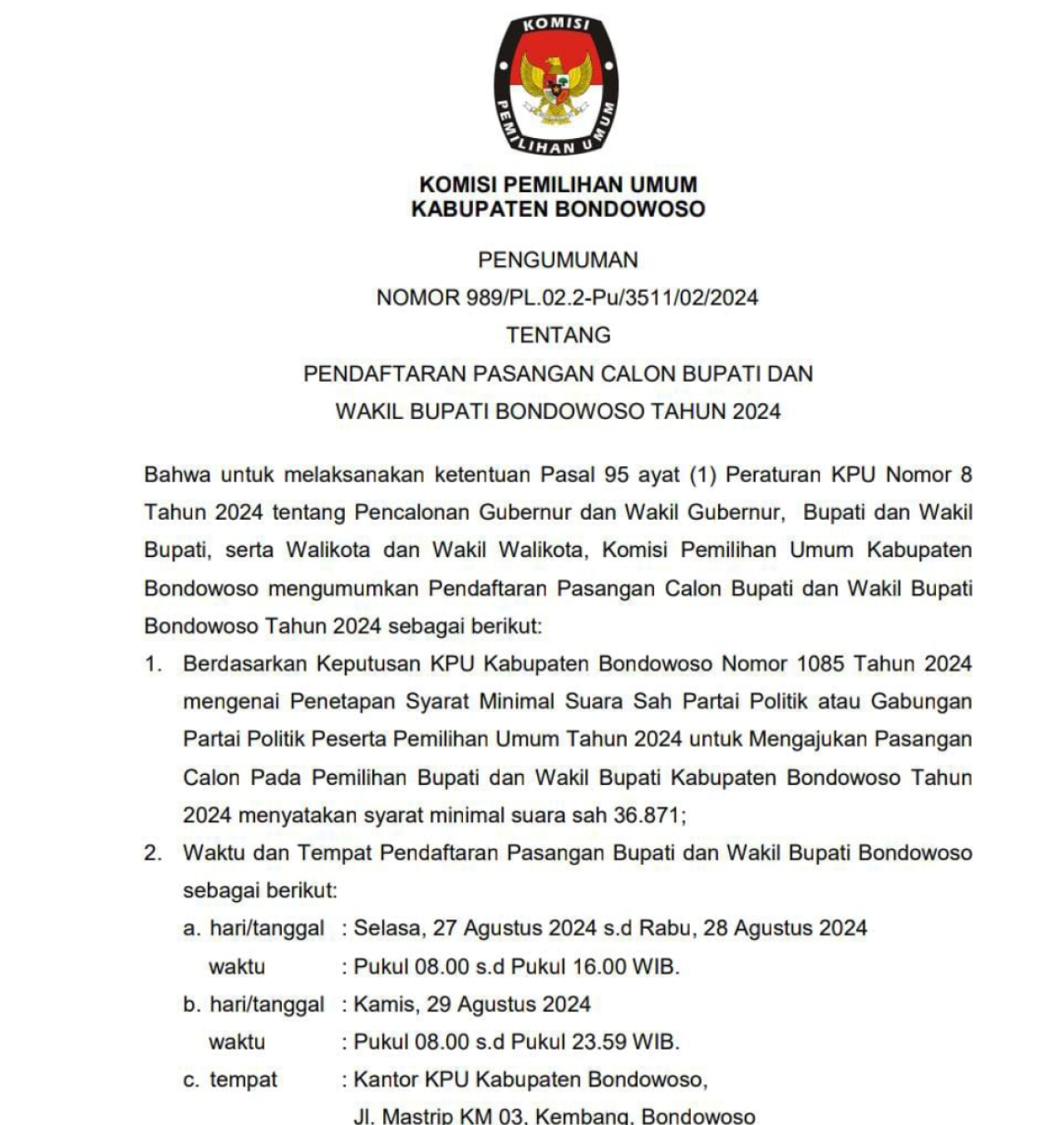 Bahwa untuk melaksanakan ketentuan Pasal 95 ayat (1) Peraturan KPU Nomor 8 Tahun 2024, Komisi Pemilihan Umum (KPU) Kabupaten Bondowoso mengumumkan pendaftaran pasangan calon Bupati dan wakil Bupati Kabupaten Bondowoso Tahun 2024 sebagai berikut:
