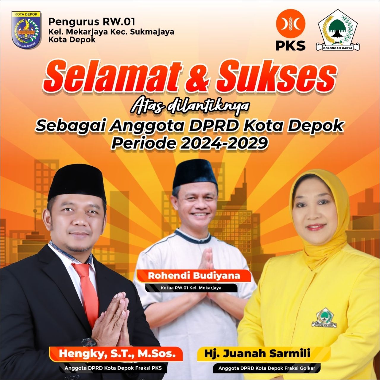 Sementara itu, warga Mekarjaya, Sukmajaya, Depok, Khususnya RW 01 merasa bangga dan senang ada dua awrganya dilantik menjadi anggota DPRD Kota Depok. "Itu dua warga saya yaitu Hj Juanah Sarmili dari Partai Golkar dan Bang Hengky dari PKS," kata pria yang diketahui bernama Rohendi Budiyana (Cueng).